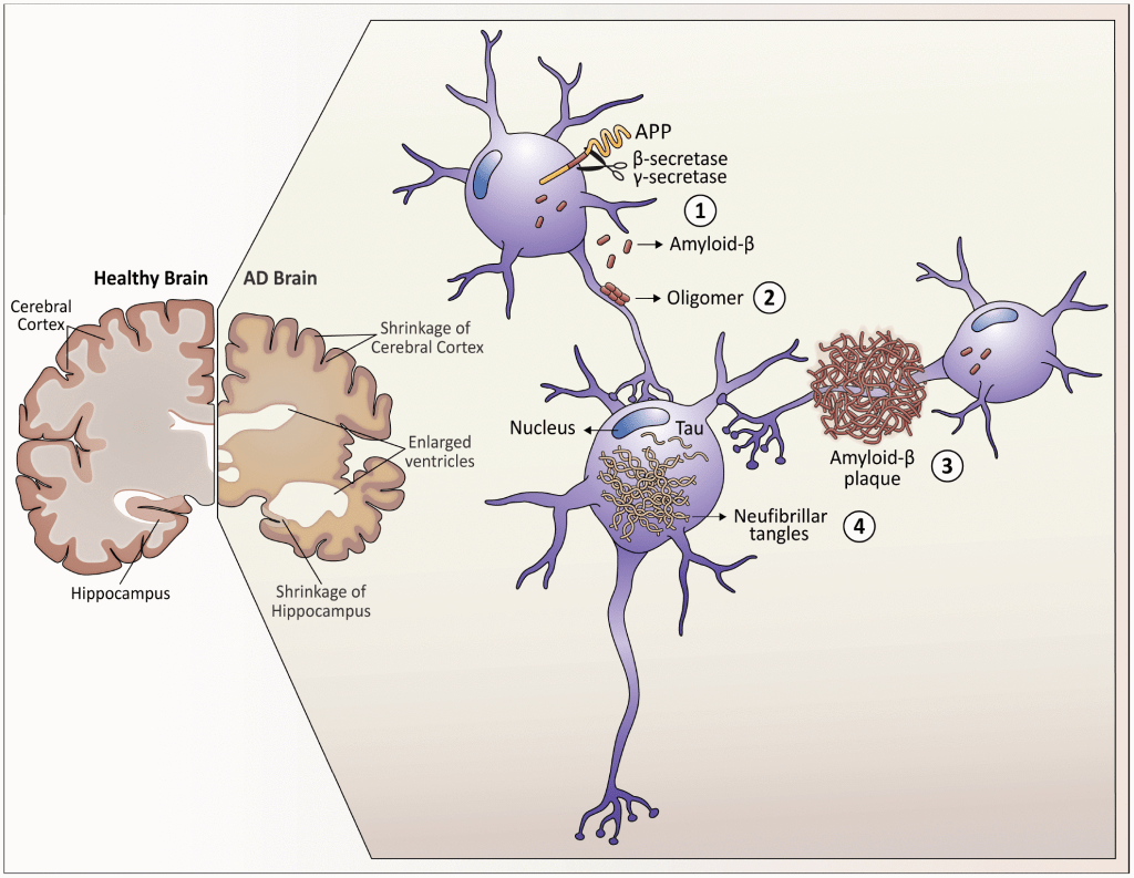 The primary component of amyloid-β (Aβ) plaques in Alzheimer’s disease is the Aβ peptide. This peptide is generated through the sequential cleavage of amyloid precursor protein (APP) by β-secretase 1 (BACE1) and a complex of γ-secretases. APP is a transmembrane protein found in the plasma membrane and various organelles of neurons, glial cells, and other peripheral tissues. This cleavage process produces peptides consisting of either 40 or 42 amino acids, known as Aβ40 and Aβ42, respectively. The Aβ42 peptide, with its two additional amino acids, has a greater tendency to aggregate, making it the most “amyloidogenic” form. This mechanism became clearer after the first case of familial early-onset Alzheimer’s disease (EOAD) was linked to mutations in the APP gene, which led to increased production of Aβ42 peptides.