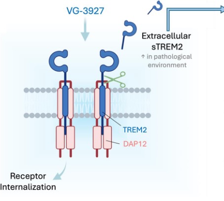 VG-3927, Vigil’s lead candidate, is a highly potent, selective, brain-penetrant oral small molecule that activates TREM2. Its mechanism of action includes promoting the internalization of the TREM2 receptor complex, which helps prevent cleavage of its extracellular domain and reduces levels of soluble TREM2 (sTREM2). Unlike antibody-based approaches, Vigil’s small molecule TREM2 agonists—including VG-3927—do not bind to sTREM2, avoiding the “sink effect” that can reduce therapeutic efficacy. By enhancing TREM2 signaling, VG-3927 is believed to support microglial function and activate neuroprotective pathways to slow disease progression in Alzheimer’s.