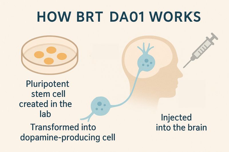 Bemdaneprocel (BRT-DA01) works by replacing the dopamine-producing neurons lost in Parkinson’s disease. Derived from pluripotent stem cells, the dopaminergic neuron precursors—originally human embryonic stem cells—mature into functional dopamine neurons after implantation. Through a surgical procedure, these precursors are implanted into the brain of a person with Parkinson’s disease, where they have the potential to rebuild damaged neural networks and restore both motor and non-motor functions.